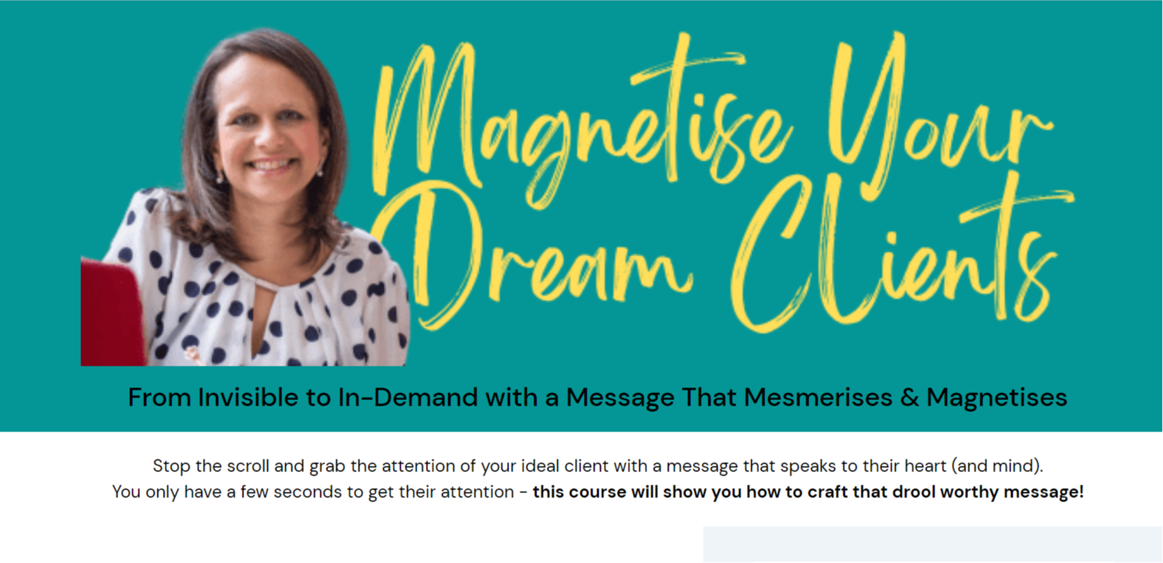 Stop the scroll and grab the attention of your ideal client with a message that speaks to their heart (and mind). You only have a few seconds to get their attention - this course will show you how!
